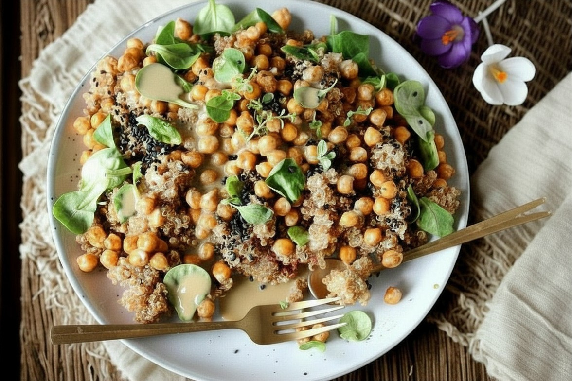 "Spring Glow" Quinoa-Salat mit Wildkräutern, gerösteten Kichererbsen und Zitronen-Tahini.
